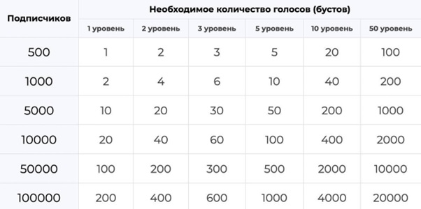 Например, для того, чтобы получить 1 уровень, количество отданных каналу бустов должно быть 0,2% от общего количества подписчиков.
